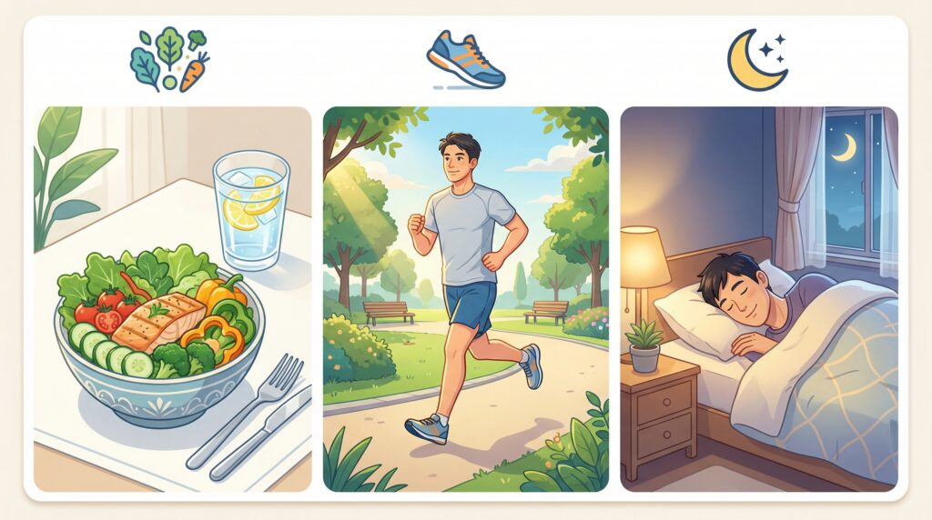- 適度な運動:週2〜3回の有酸素運動で「良い汗」をかく習慣をつける