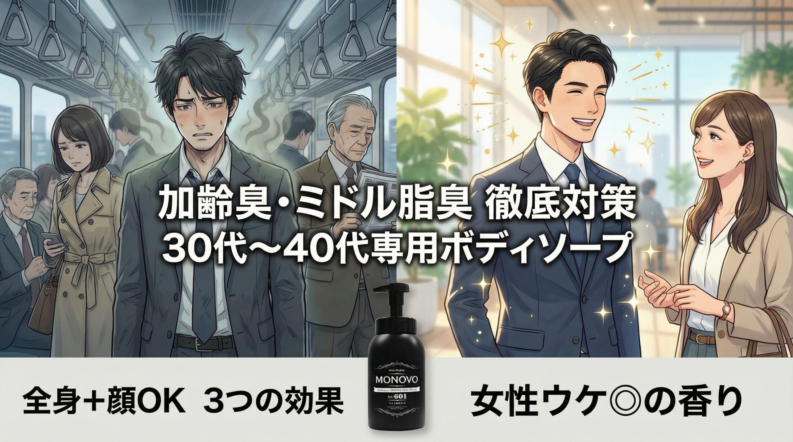 この記事では、30代〜40代の体臭に本気で悩む男性のために、根本からニオイを断つボディソープをご紹介します。特に、全身+顔まで1本で洗えて、体臭・ニキビ・エイジングケアまでできる「MONOVOデオドラントボディ&フェイスウォッシュ」を中心に、実際の使用感も包み隠さずレビューします。