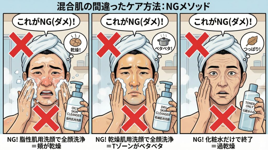 混合肌を悪化させる、よくある間違いを3つ紹介します。これらは善意から行っているケースが多いのですが、実は逆効果です。