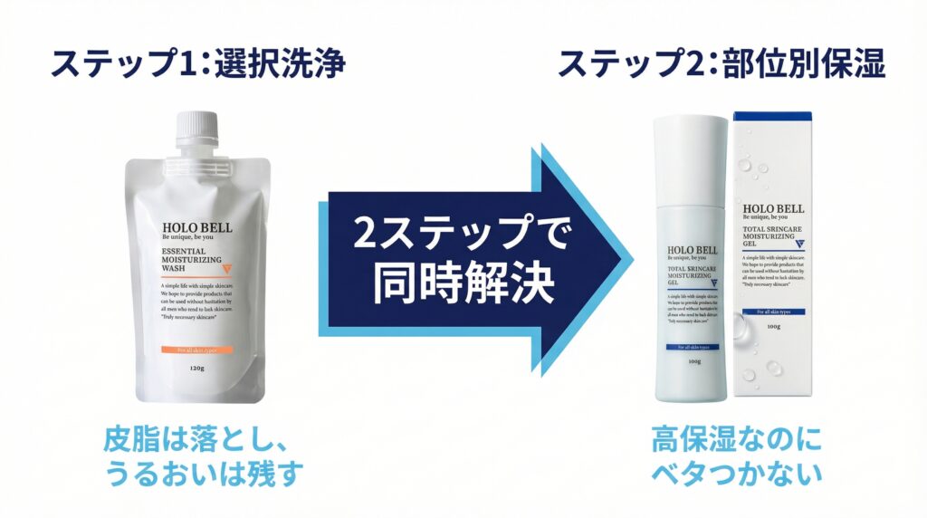 混合肌の正解:「選択洗浄+部位別保湿」の2ステップ