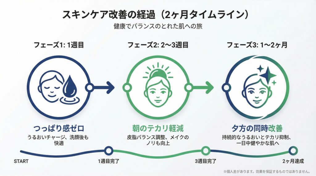 - 1〜2ヶ月:夕方のテカリも明らかにマシになり、頬の乾燥と同時に改善を実感
