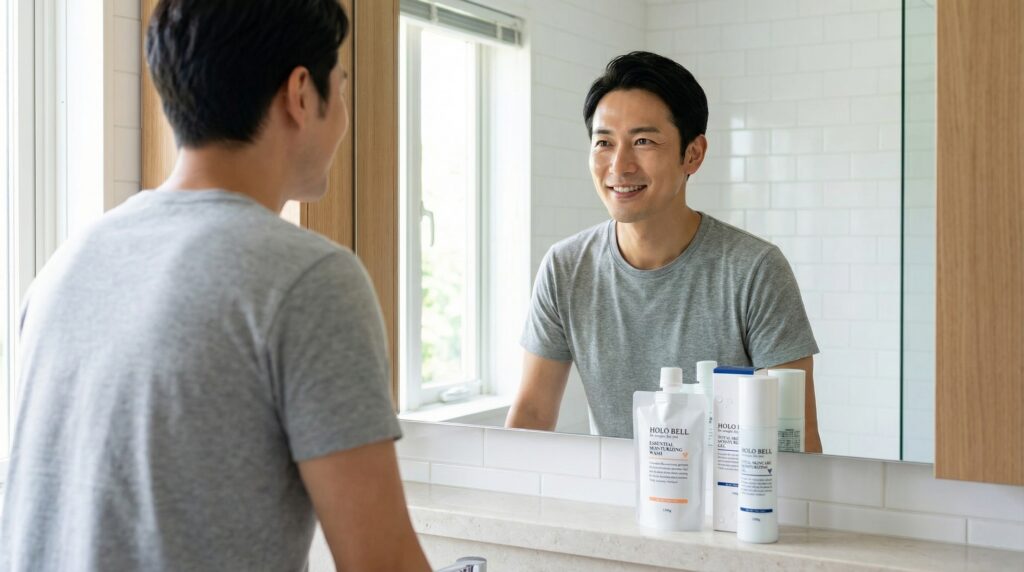 朝・夜ともにこれだけです。慣れれば合計でも1日5分かからないので、忙しい男性でもストレスなく続けられます。
