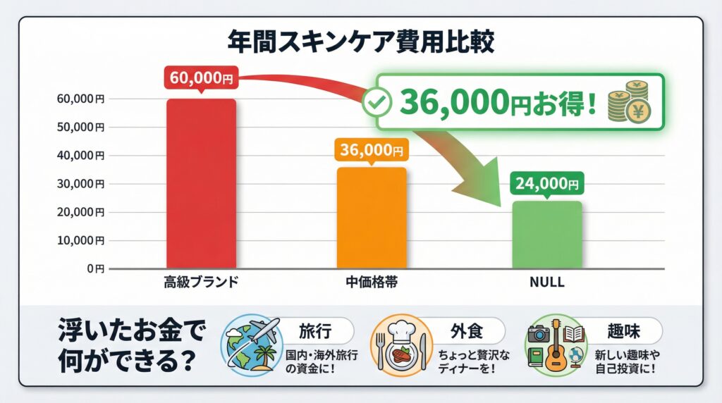 💡 重要な真実:スキンケアで最も大切なのは「高価な商品」ではなく「継続できる価格」です。月1,500円を12ヶ月続ける方が、月5,000円を3ヶ月で挫折するより圧倒的に効果があります。