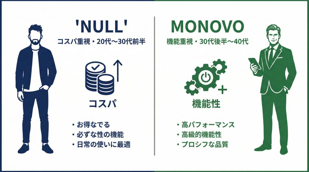 つまり、「コスパのNULL」「総合力のMONOVO」という住み分けが明確にあります。